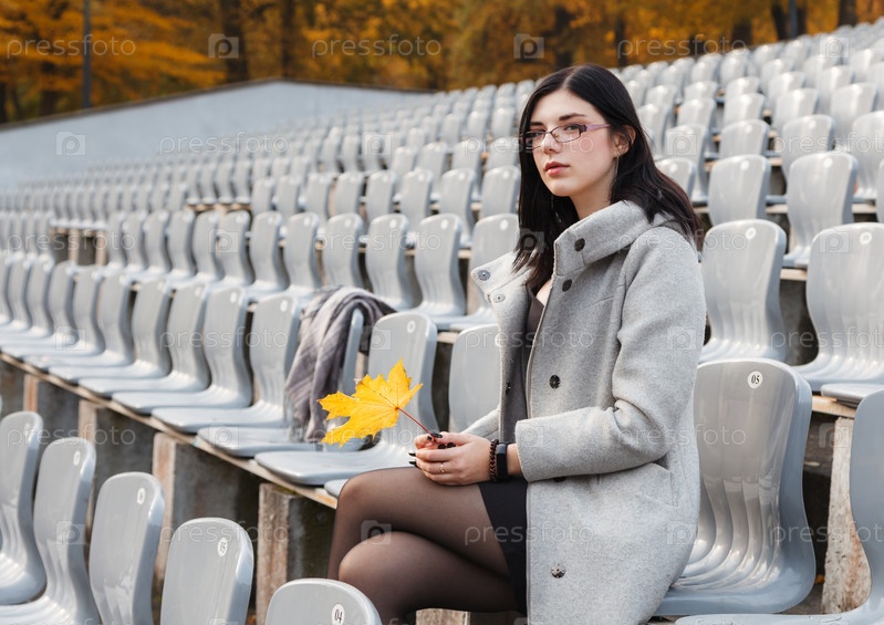 Маленькая девочка в сером пальто сидит на месте пустого стадиона