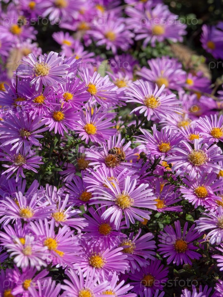 Розовые цветы астры в саду. Крупный план красивой цветущей карликовой розовой альпийской астры с цветами в форме маргаритки, образующими низкий куст или живую изгородь осенью