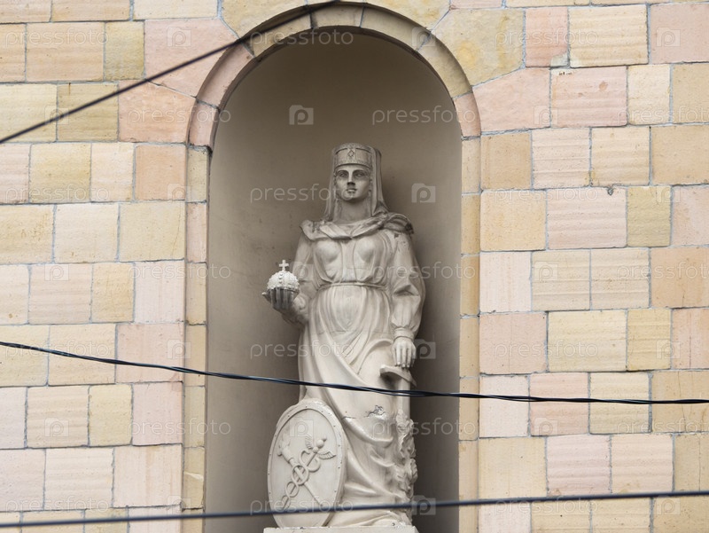 Старинная статуя в нише кирпичного дома. Скульптура женщины с силой и мечом в руках имеет щит у ног. Провода проходят через передний план. Памятник архитектуры