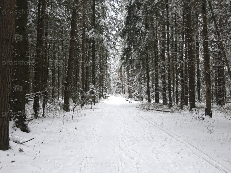 Зимняя дорога на снегу с лыжнями и следами от квадроциклов на фоне хмурого неба
