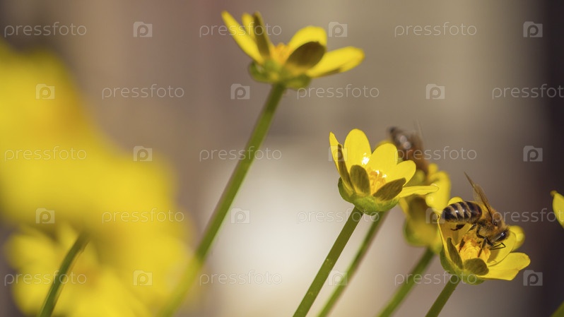 Пчела собирает пыльцу на первых маленьких желтых цветках весны