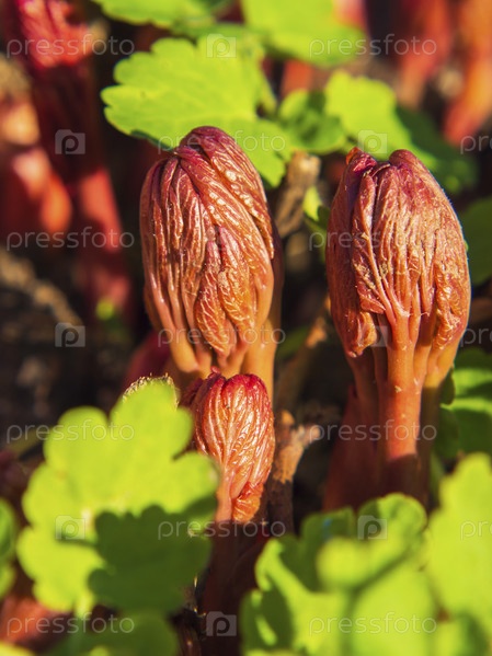 Яркие ростки куста пиона растут на клумбе в весеннем саду под лучами весеннего солнца. Весенний фон листьев растений. Молодые бордовые побеги куста пиона ранней весной