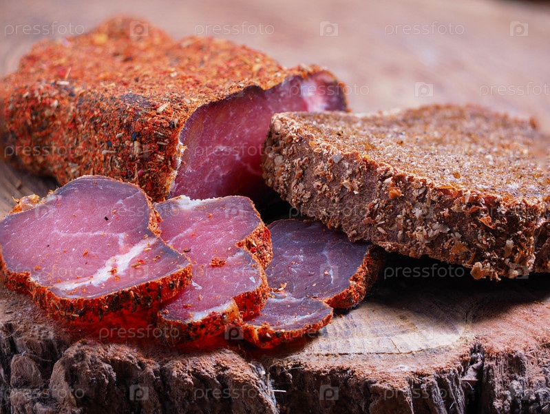 Сочные вкусные ломтики вяленого мяса (бастурма), посыпанные разными специями, с куском серого хлеба на деревянном пеньке. Крупный план вкусной вяленой закуски