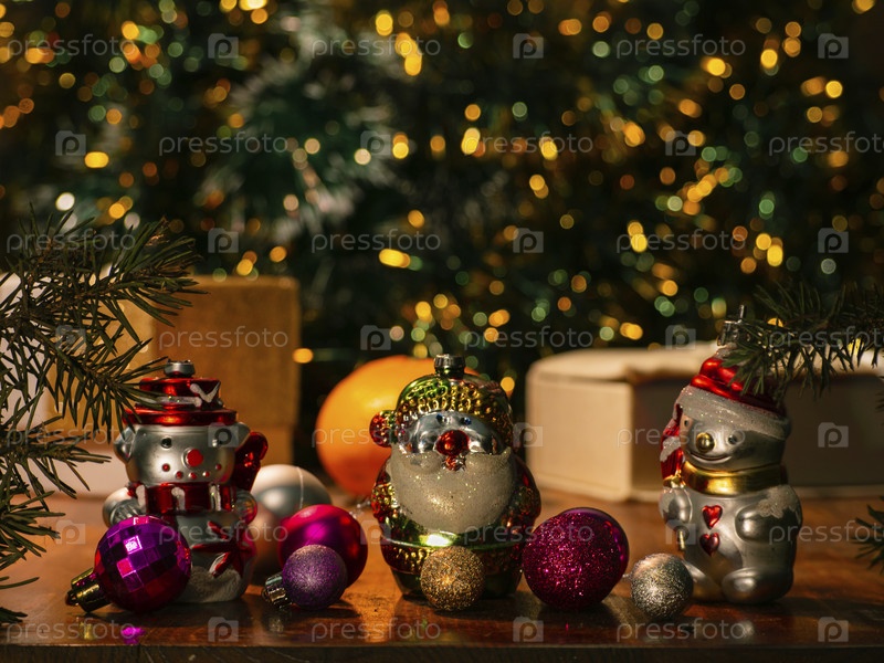 Концепция Рождества и Нового года. Рождественские игрушки (снеговик, Дед Мороз) на фоне подарков под елкой. праздничный фон зимнего праздника. Открытка, место для копирования