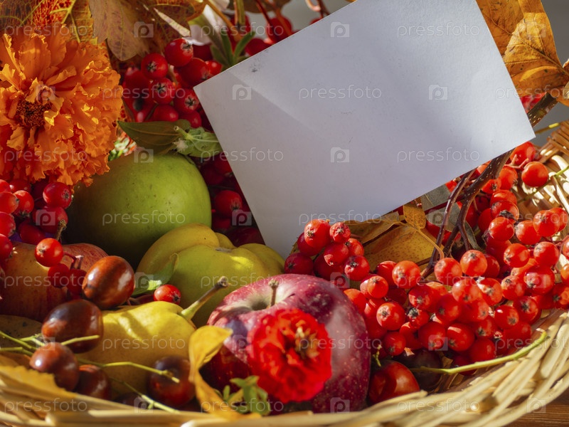 Красивый осенний натюрморт с фруктами, ягодами, осенней листвой и листом белой бумаги. Используйте его, чтобы разместить текст на пустом месте. В корзине яблоки груши айва рябина осенние листья