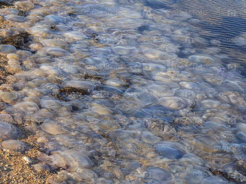 Песчаный берег моря покрыт множеством мертвых медуз. Экологическая катастрофа. Жарким солнечным днем на берегу лежит огромное количество белых мертвых медуз. Проблемы окружающей среды