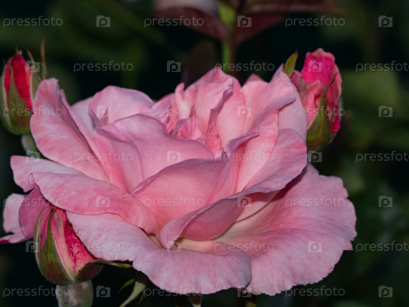 Крупный план натурального цветка розы с мягкими бледно-розовыми лепестками, окруженного нераспустившимися бутонами в зеленом саду. Цветущие розовые розы