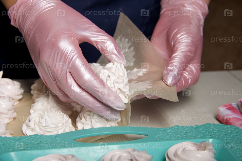 Женщина снимает половину зефира с пищевой бумаги. Зефир домашний. Белый поднос с зефиром