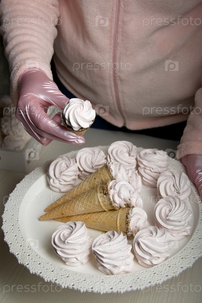 Домашний зефир в вафельных рожках. Зефир домашний. Женщина держит поднос с зефиром