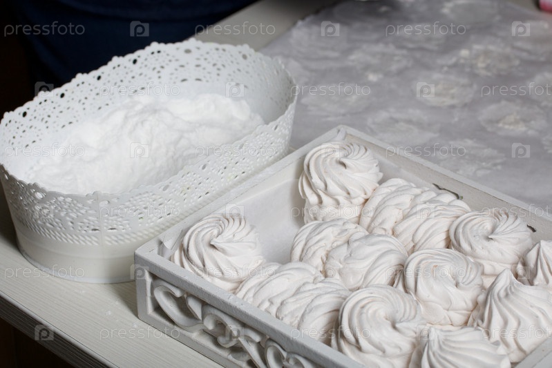 Зефир домашний. Белый поднос с зефиром. Рядом находится контейнер с декстрозой. Для обработки зефира