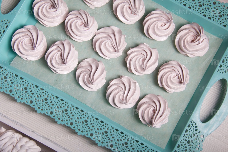 Зефир домашний. Белый поднос с зефиром. Стоит на досках из черной сосны