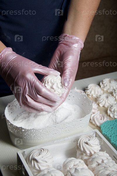 Зефир домашний. Белый поднос с зефиром. Женщина посыпает зефир декстрозой