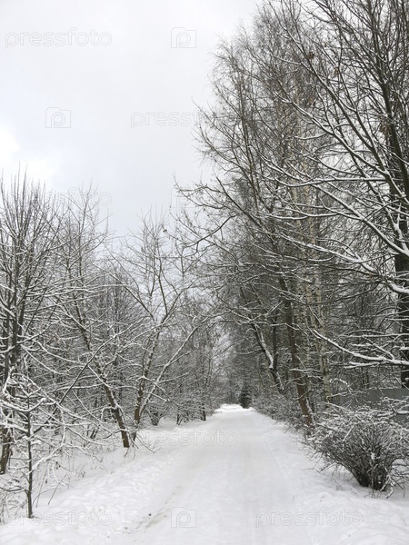 Зимняя дорога на снегу с лыжнями и следами от квадроциклов на фоне хмурого неба