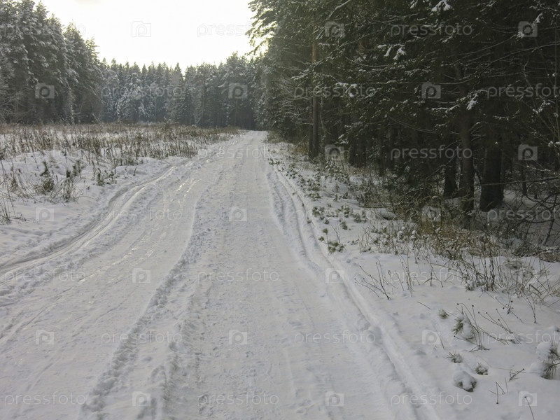 Зимняя дорога на снегу с лыжнями и следами от квадроциклов на фоне хмурого неба