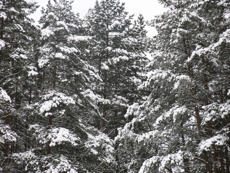 Заснеженные верхушки сосен в лесу днем зимой