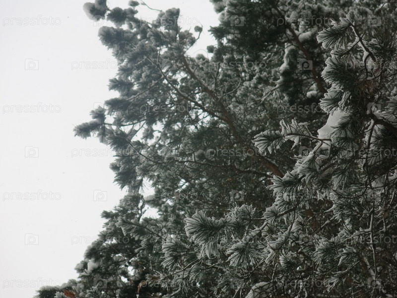 Заснеженные верхушки сосен в лесу днем зимой