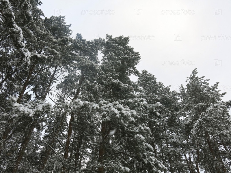Заснеженные верхушки сосен в лесу днем зимой