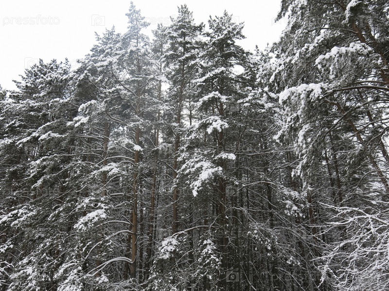 Заснеженные верхушки сосен в лесу днем зимой