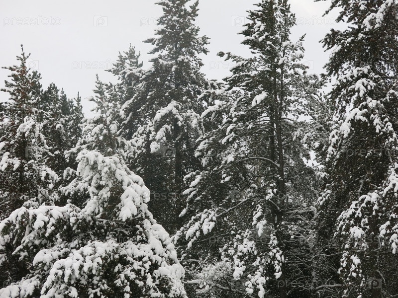 Заснеженные верхушки сосен в лесу днем зимой