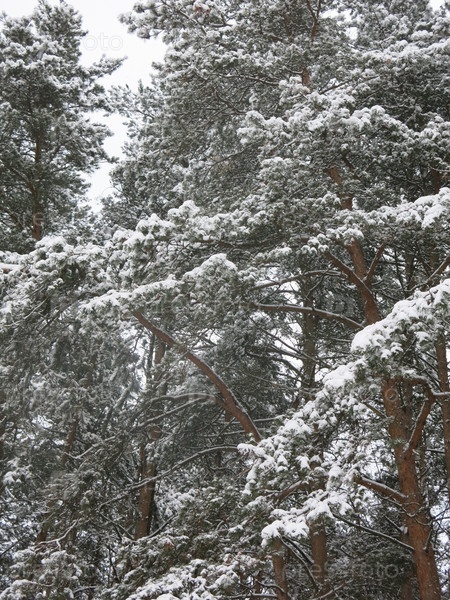 Заснеженные верхушки сосен в лесу днем зимой