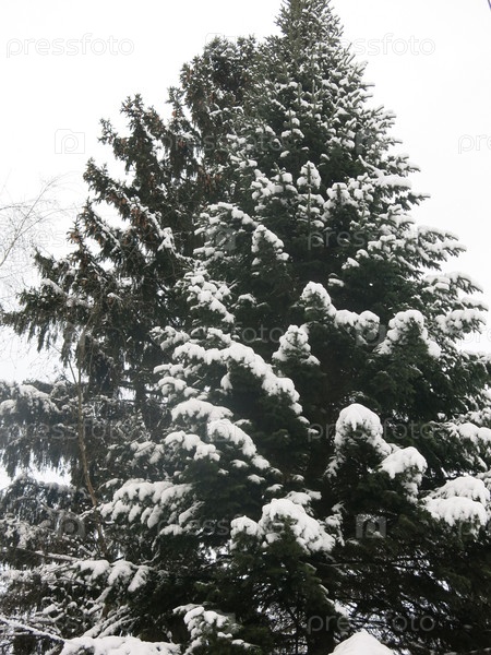 Заснеженная ель зимой в лесу