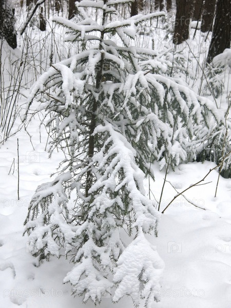 Заснеженная ель зимой в лесу
