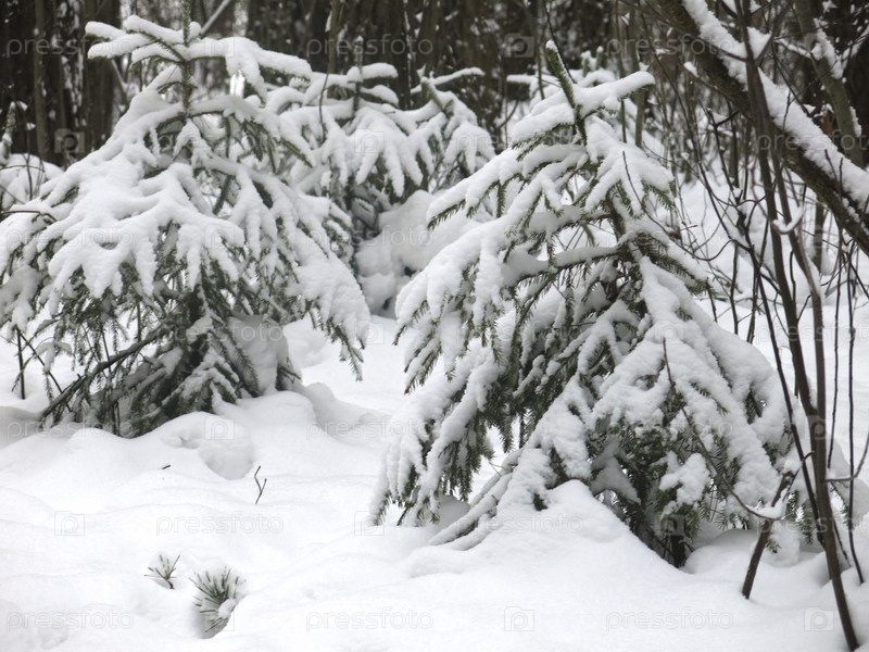 Заснеженная ель зимой в лесу