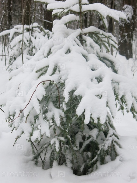 Заснеженная ель зимой в лесу