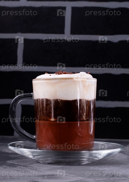 Bicerin, многослойный итальянский кофейный напиток с шоколадом и сливками в стакане на фоне черной кирпичной стены