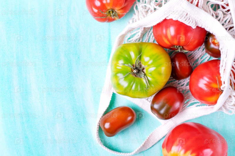 Различные помидоры в белом сетчатом мешке на синем фоне с копировальным пространством. Вид сверху