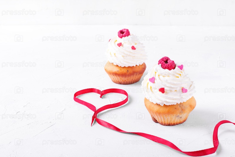 Капкейки со взбитыми сливками, посыпкой в форме сердца и малиной. Красная атласная лента в виде сердца на белом столе