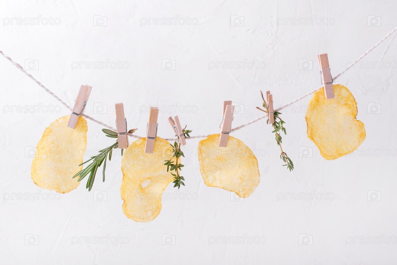 Картофельные чипсы, розмарин и тимьян висят на веревке с прищепками на белом фоне. Концептуальное фото с хрустящей закуской