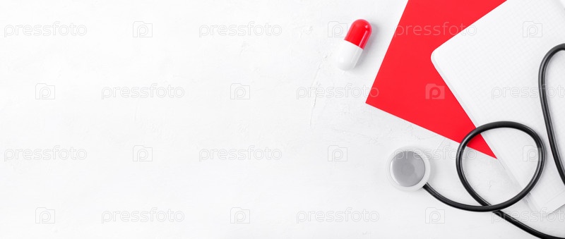 Медицинское образование. Красная и белая таблетка, стетоскоп, красная тетрадь и пустая страница на белом столе. Время для проверки. Баннер с копией пространства