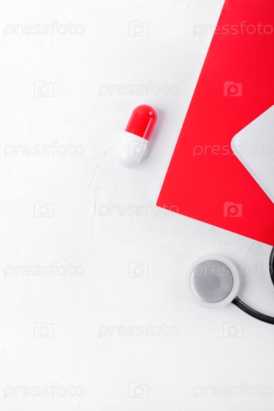 Медицинская плоская планировка. Красная и белая таблетка, стетоскоп и красная тетрадь на белом столе. Время для проверки