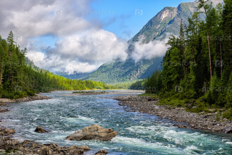 Низкие рассеянные облака над бурной речкой