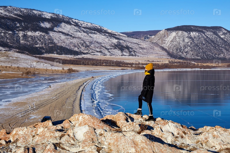 Молодая девушка путешествует по озеру Байкал зимой. Красивый зимний горный пейзаж, прозрачный лед