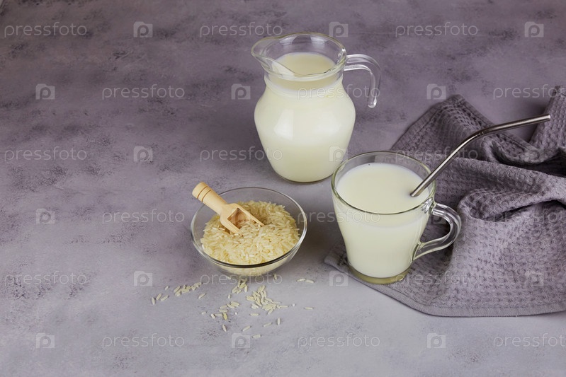 Рисовое молоко в стеклянной кружке и кувшине на темно-сером фоне