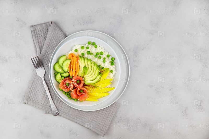 Поке боул с лососем, рисом, авокадо, огурцом, манго, микрогрином