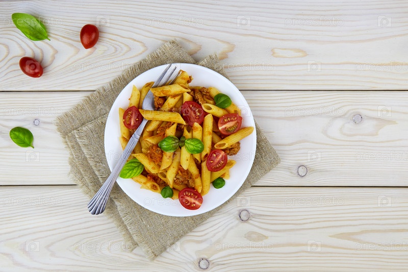 Классическая итальянская паста болоньезе пенне с томатами, базиликом