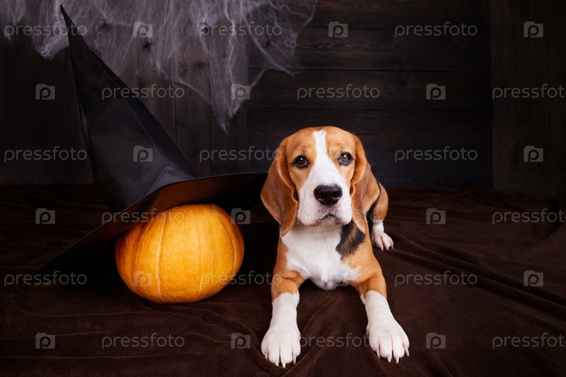 Осенний праздник Хэллоуин. Собака бигля смотрит в камеру