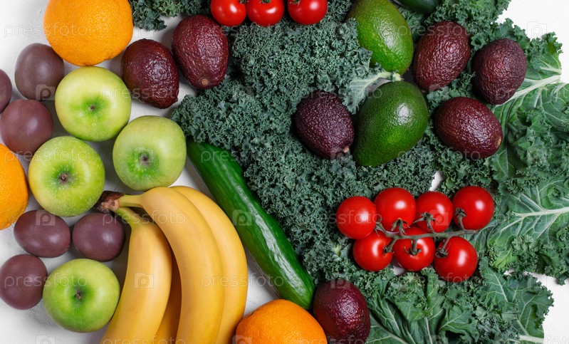 Ассорти из фруктов и овощей. Капуста, авокадо, помидоры черри и огурцы с одной стороны. Яблоко, банан, маракуйя и апельсин с другой