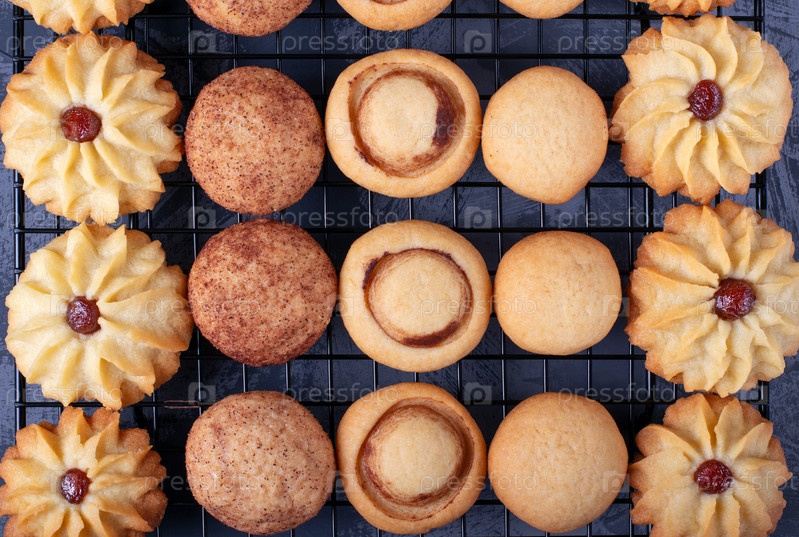 Ассортимент песочного печенья на решетке из печенья на сером деревянном столе. Вид сверху