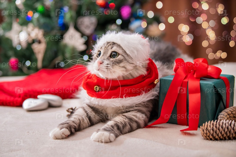 Рождественский кот. Портрет толстого пушистого кота рядом с подарочной коробкой на фоне елки и огней гирлянд