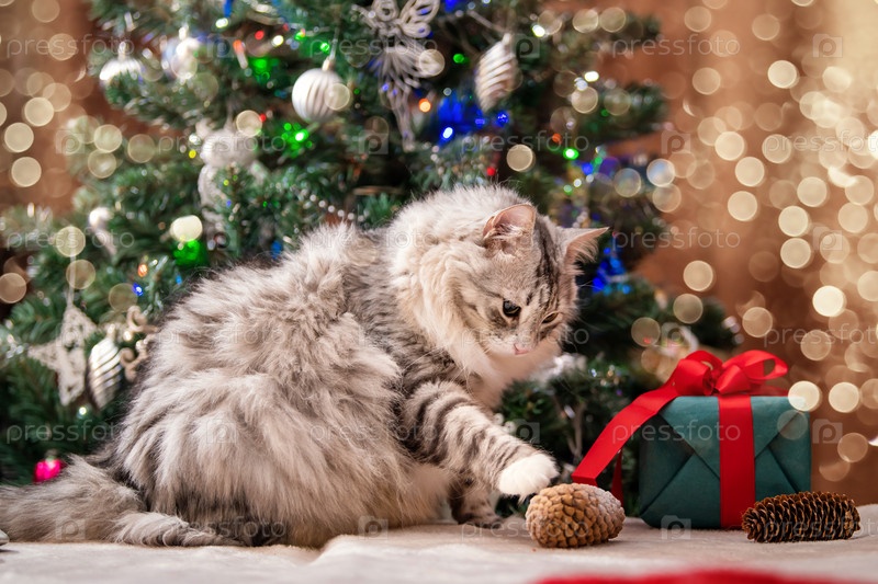 Рождественский кот. Портрет толстого пушистого кота рядом с подарочной коробкой на фоне елки и огней гирлянд