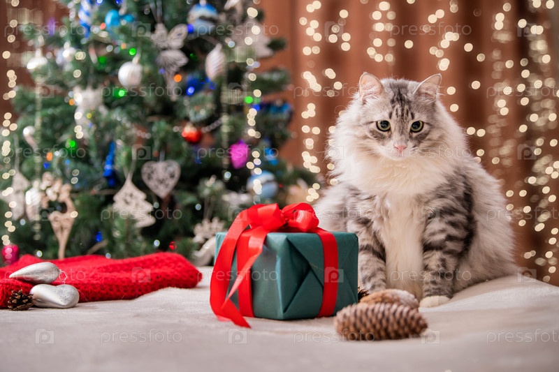 Рождественский кот. Портрет толстого пушистого кота рядом с подарочной коробкой на фоне елки и огней гирлянд