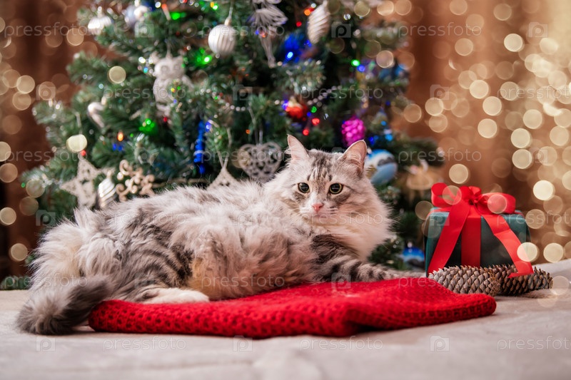 Рождественский кот. Портрет толстого пушистого кота рядом с подарочной коробкой на фоне елки и огней гирлянд