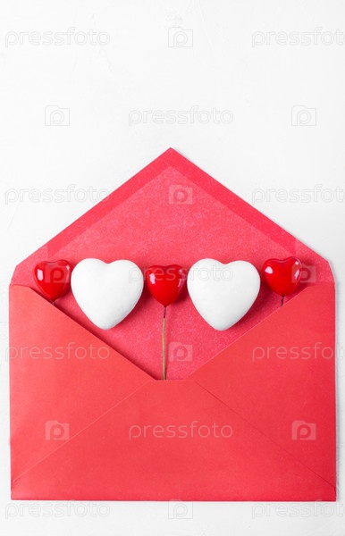 День святого Валентина фон с декоративными сердечками в красном конверте на белом столе