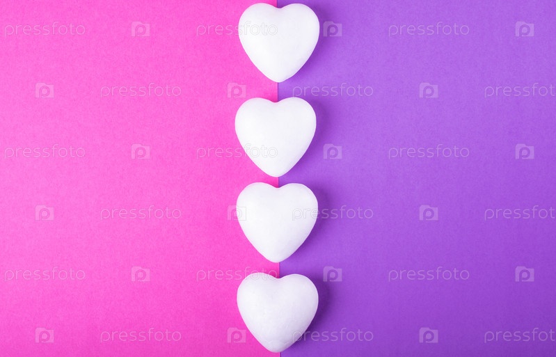 Линия белых сердец на двухцветном розовом и фиолетовом геометрическом фоне. Фон Дня святого Валентина. Концептуальная плоская планировка