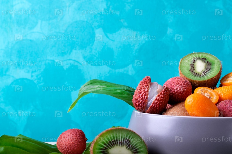 Личи, киви и кумкват в серой керамической миске на бирюзовом фоне. Ассорти из тропических фруктов. Копировать пространство