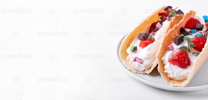 Сладкие тако с тонкой вафлей, творожным кремом и клубникой, покрытые шоколадом и мятой. Десертная вариация мексиканской классики. Широкий баннер с копией пространства